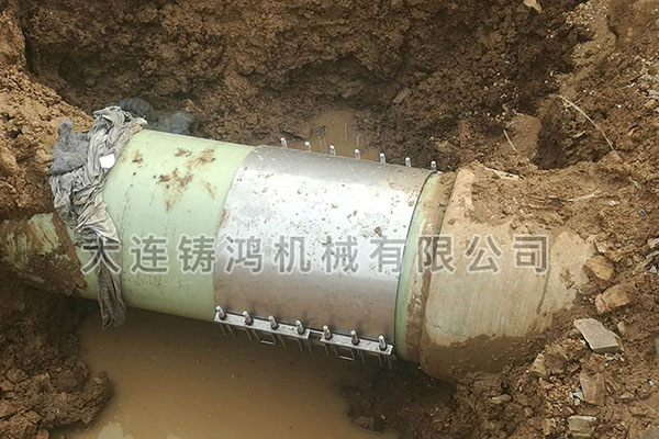 大連某工地玻璃鋼污水管道在施工過程中讓挖掘機把管道挖壞,施工現(xiàn)場環(huán)境全是水,所以先進行排水作業(yè),清除污水后,發(fā)現(xiàn)620玻璃鋼管發(fā)生泄漏,漏點漏洞有將近一拳頭大,根據(jù)現(xiàn)場工況,傳統(tǒng)修補方式必須停水停壓,晾干,沾糊,現(xiàn)場不能停水停壓,使用鑄鴻板式修補器615-635規(guī)格進行快速帶壓修補,用時8分鐘完成修復,現(xiàn)場領導非常滿意。(修補前)(修補中)(修復后)